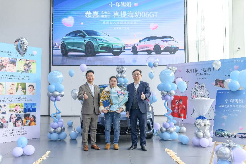 随后,王传福总裁一行抵达安徽盛世迪耀。总裁依次走访销售展厅、售后维修车间与客户休息区,细致核查车辆维保流程、配件供应体系及员工专业培训情况。恰逢门店举办客户交车仪式,我司有幸邀请王传福总裁为车主亲自交车。现场,总裁与车主亲切握手,亲手交付车钥匙,并赠送鲜花及亲笔签名的交车礼品,贴心叮嘱车主用车过程中若有问题可随时联系门店。